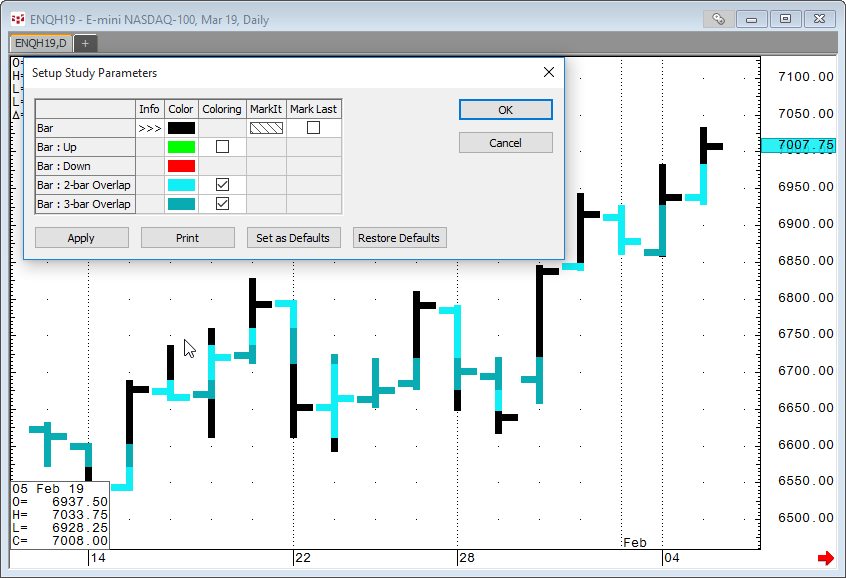 A new feature for your charting is coloring each bar's price range with up to two previous overlapping bar's price ranges. This overlapping bar coloring feature can help identify periods of price congestion that may be a precursor to a trend.