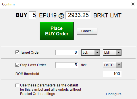 Bracket orders, a favorite order type among profession traders, are a combination of a profit target order and a stop loss order which are automatically placed when your entry order is filled.