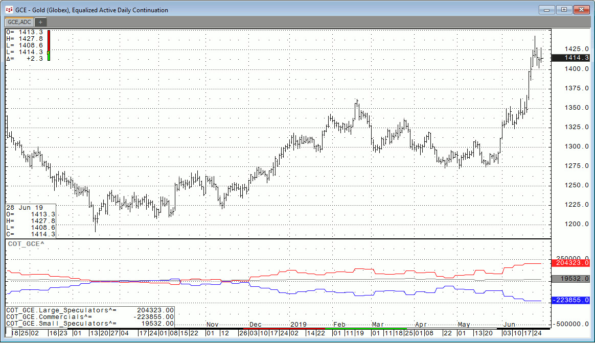 The chart example is using the XLTS study. The CFTC Commitment of Traders data (Large Net Speculators, Net Commercials, and Net Small Speculators) for the gold market is maintained in an Excel spreadsheet and is displayed on the chart using the XLTS study.