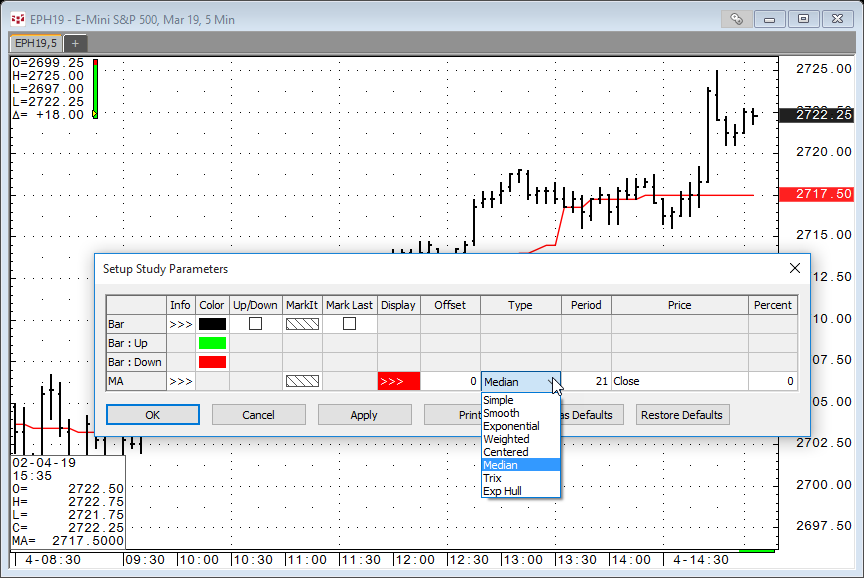 CQG's popular moving average study provides you with more flexibility with the addition of three new moving average types: The Median, Trix (triple exponential smoothing) and the Exponential Hull Moving Average.