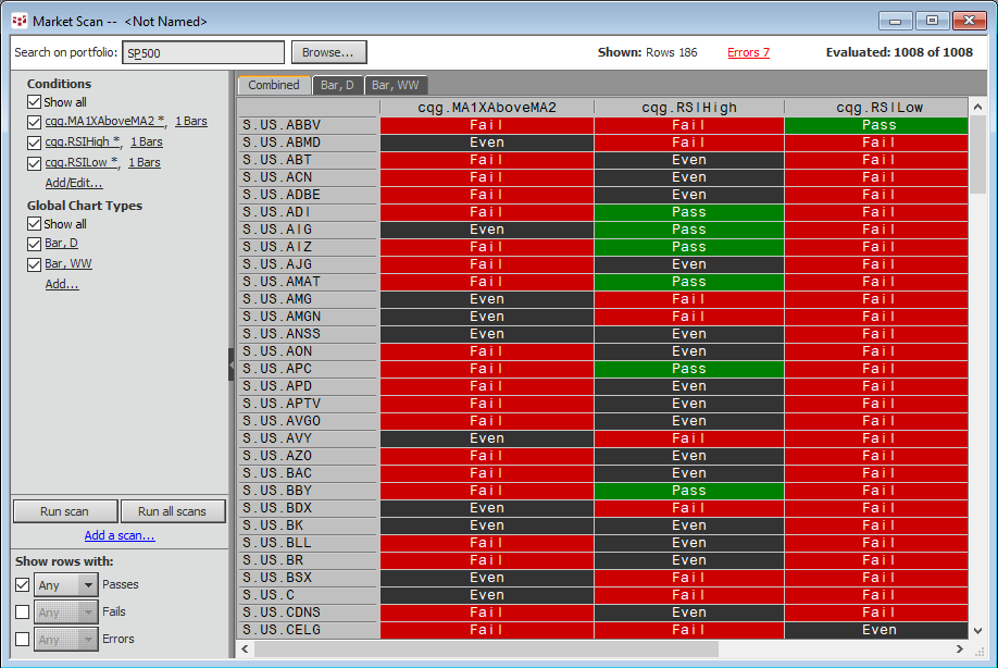 CQG's market scan can analyze a portfolio of stocks and identify which stocks are meeting your conditions. You can create any condition you want to use.