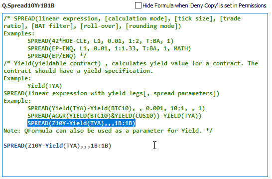 If you define a spread as SPREAD(Z10Y-Yield(TYA),,,1B:1B) then the additional B in the trading ratio is buying this spread means buy 1 Z10Y and buy 1 TYA. S is also available.